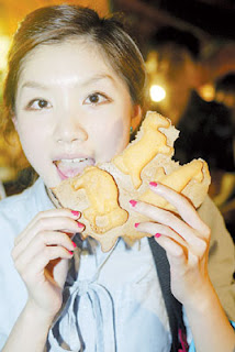 剛烤好的一整片雞蛋糕,還軟軟的像橡皮糖一樣,只見歐巴桑拿著一張紙猛煽,說也奇怪,雞蛋糕到了我手上,變得硬梆梆。